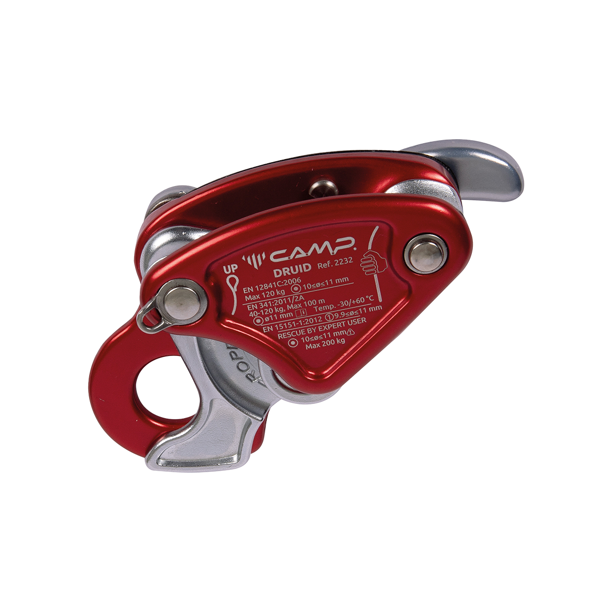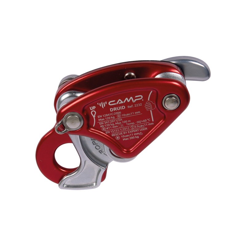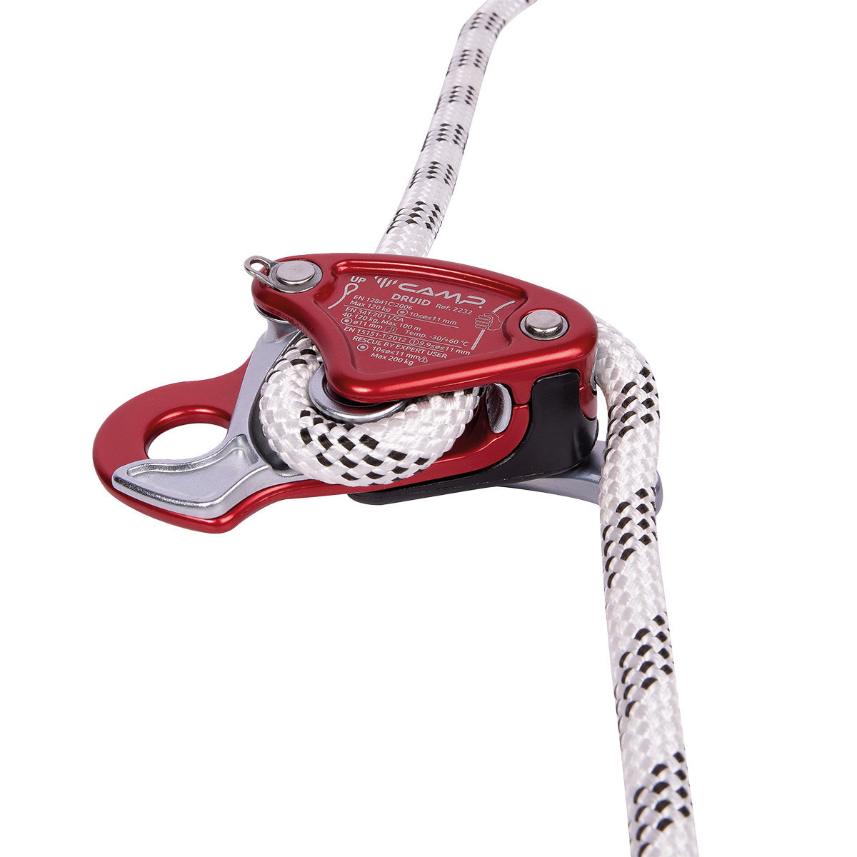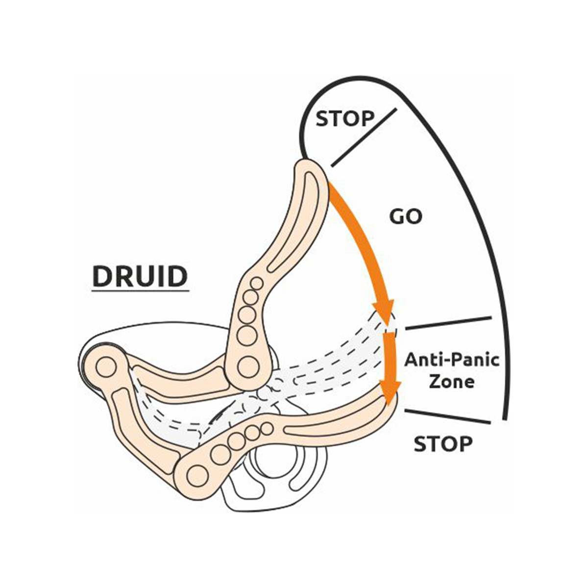 Mechanical parts are made of precision-cast stainless steel. The internal mechanism and locking cam use a patented design for smooth action on the rope which prevents rapid wear-and-tear and absorbs energy from small shocks with a slight amount of rope slippage. The fluid action on the rope also allows the Druid to function well for rope ascent. The cam can be de-activated with a trigger to allow quick sliding of the rope in situations with no load or limited load. Steel ring for attaching a keeper cord.