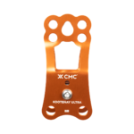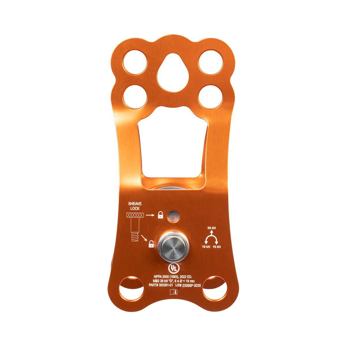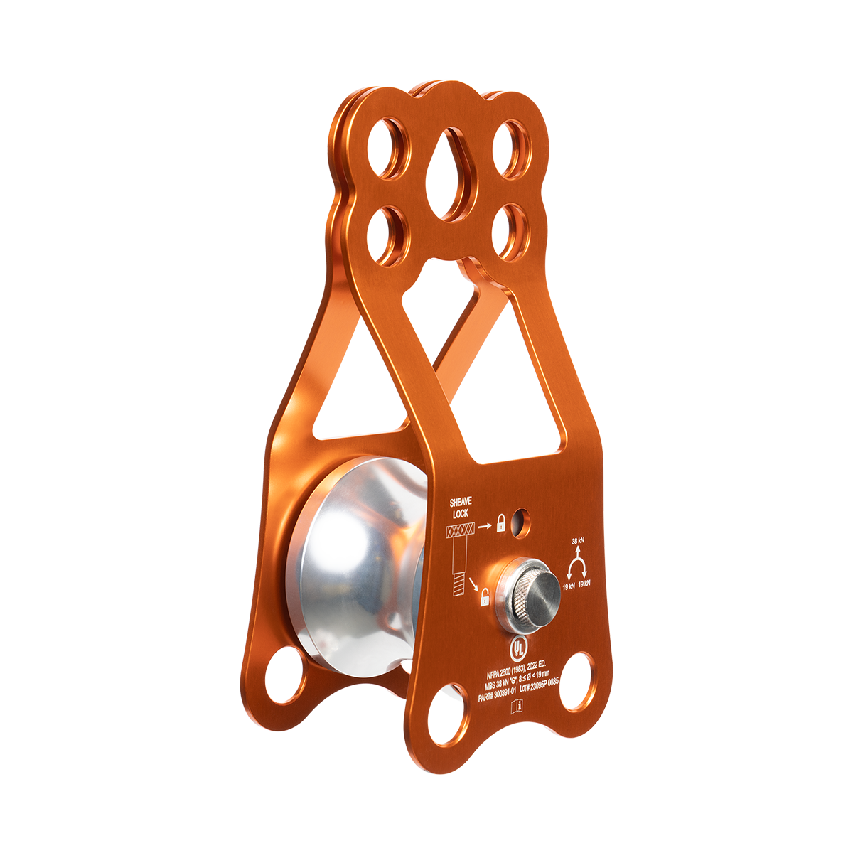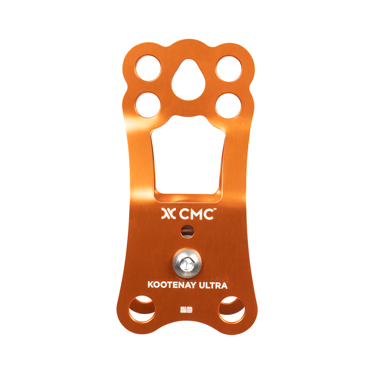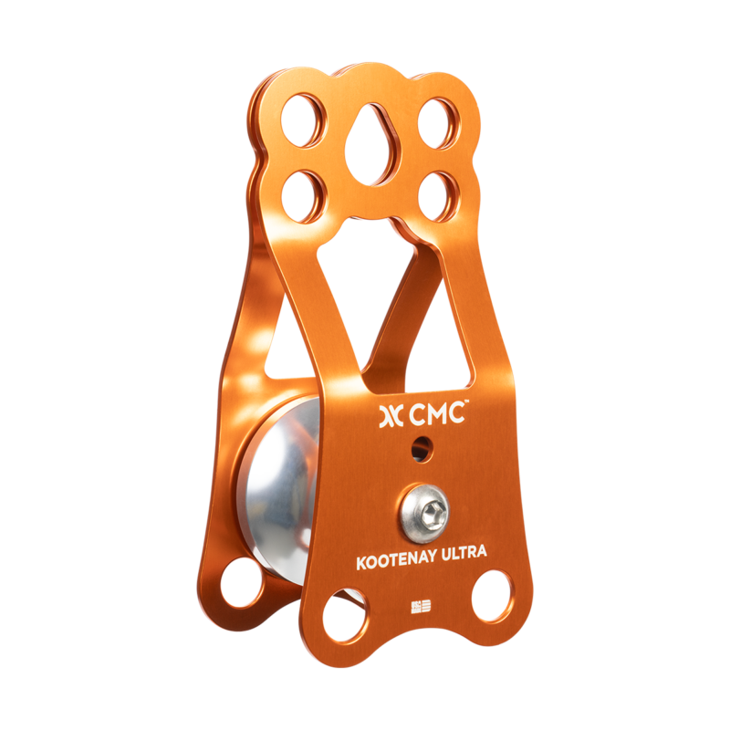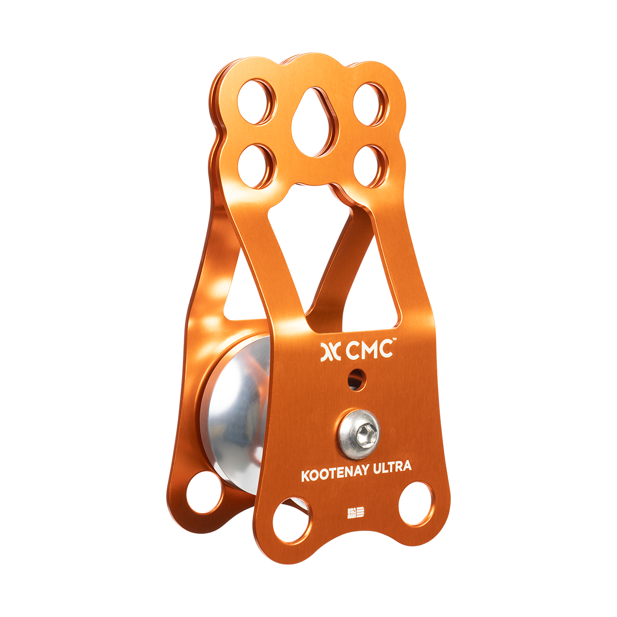 The CMC Kootenay Ultra Pulley is the most functional, versatile knot-passing and high-strength tie-off pulley available. For high lines, the rigging holes allow for optimum separation of tag lines and hoist ropes for reeving variations. For English and Norwegian reeves, a greater spread between the hoist pulleys significantly reduces the chance of inadvertent spinning of the load. Separate rigging holes make rigging easier and also prevent carabiners from binding against each other. For high-strength tie-offs, the integrated sheave-lock pin inserts easily into the sheave-lock hole from its stowed axle position. The strong, durable anodized aluminum sheave is fitted with sealed ball bearings for long wear and high efficiency.