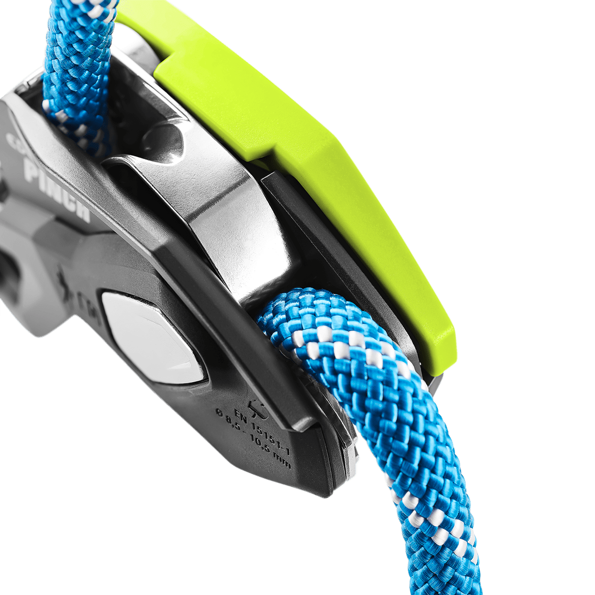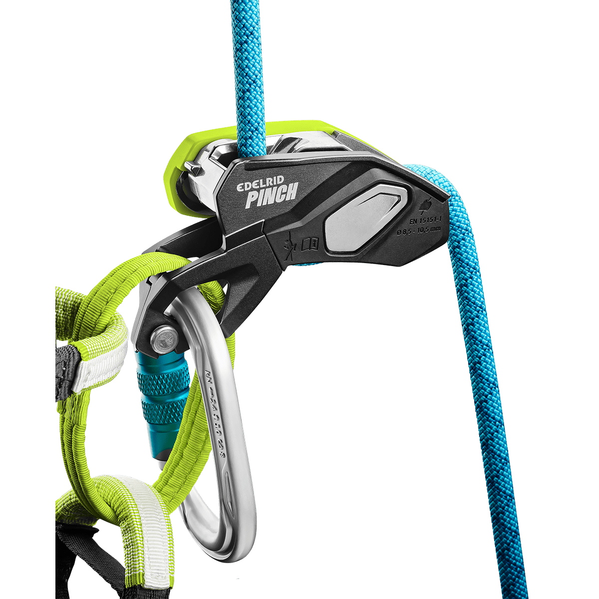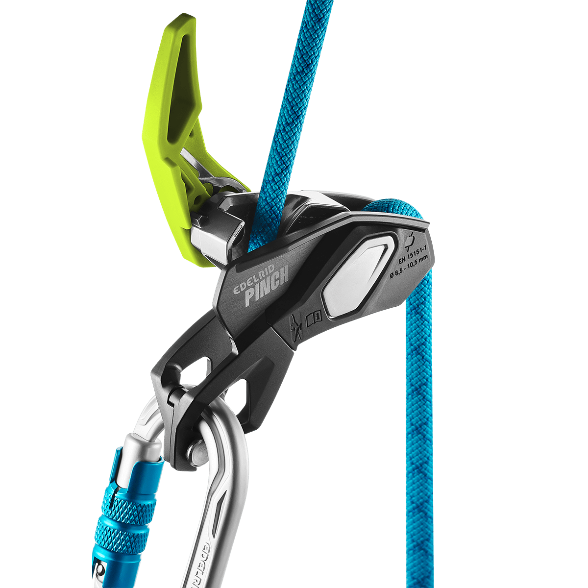 The Edelrid Pinch is a versatile assisted braking belay device and the first device on the market that can be attached directly to the central ring of the climbing harness. Thanks to its low, close-to-the-body position, the Pinch does not need to be fixed in place when releasing the rope and the brake rope can always be gripped with all fingers.