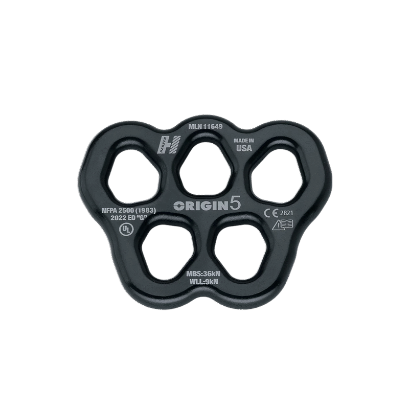 The Origin 5 is Harken’s lightest rigging plate has just the right number of connection points to keep your rigging organized and it is ideal as a master point for litter bridles. The large connection holes allow you to easily rotate most locking carabiners. Strong, with an MBS of 36kN in any direction, the Origin 5 is manufactured with custom tooling to create textile-friendly rounded edges.