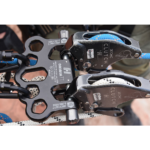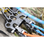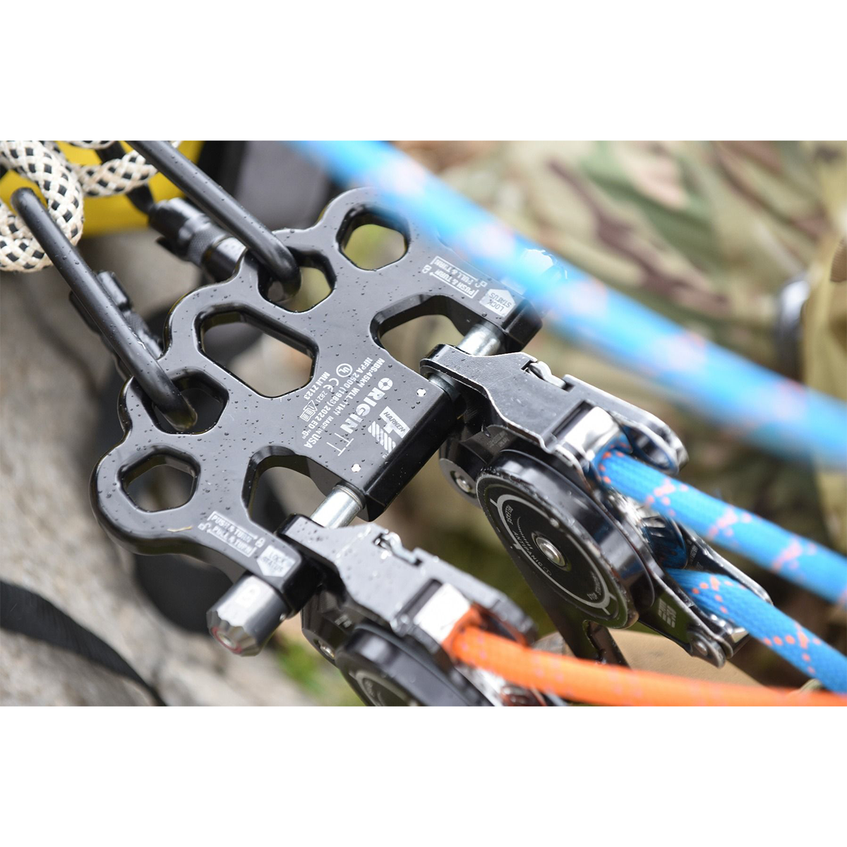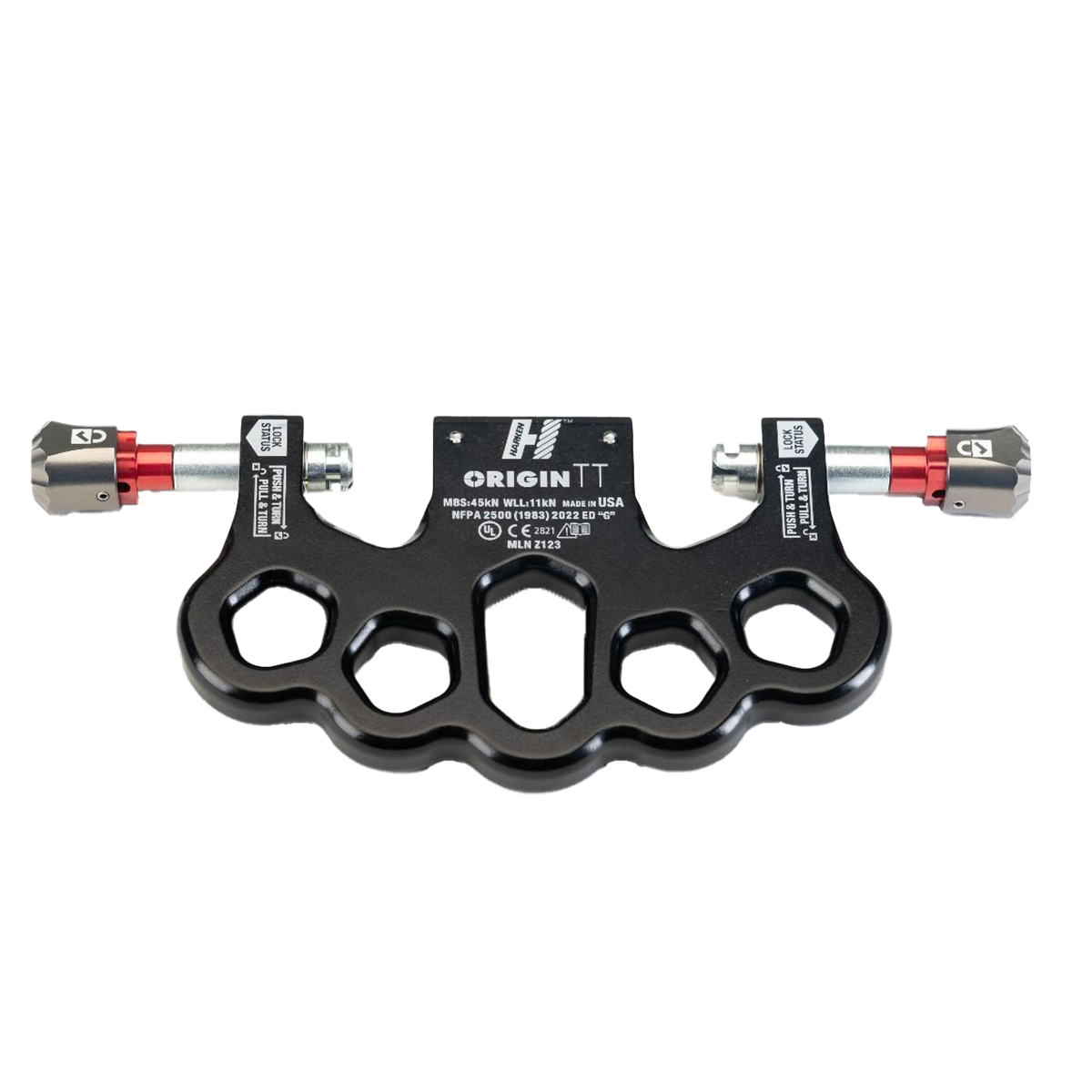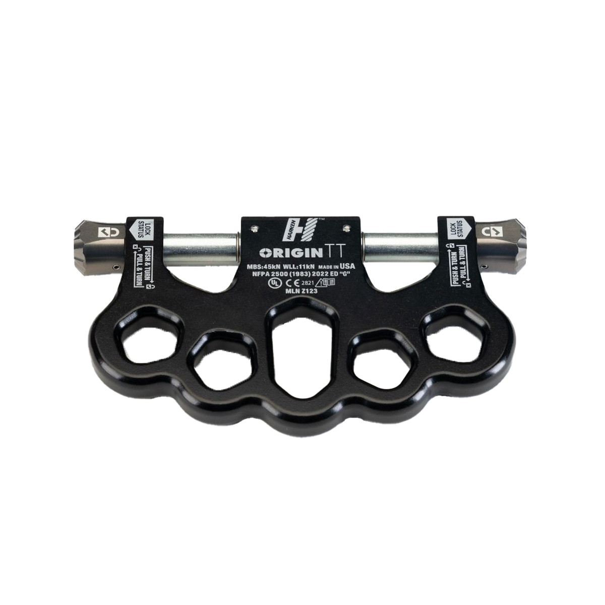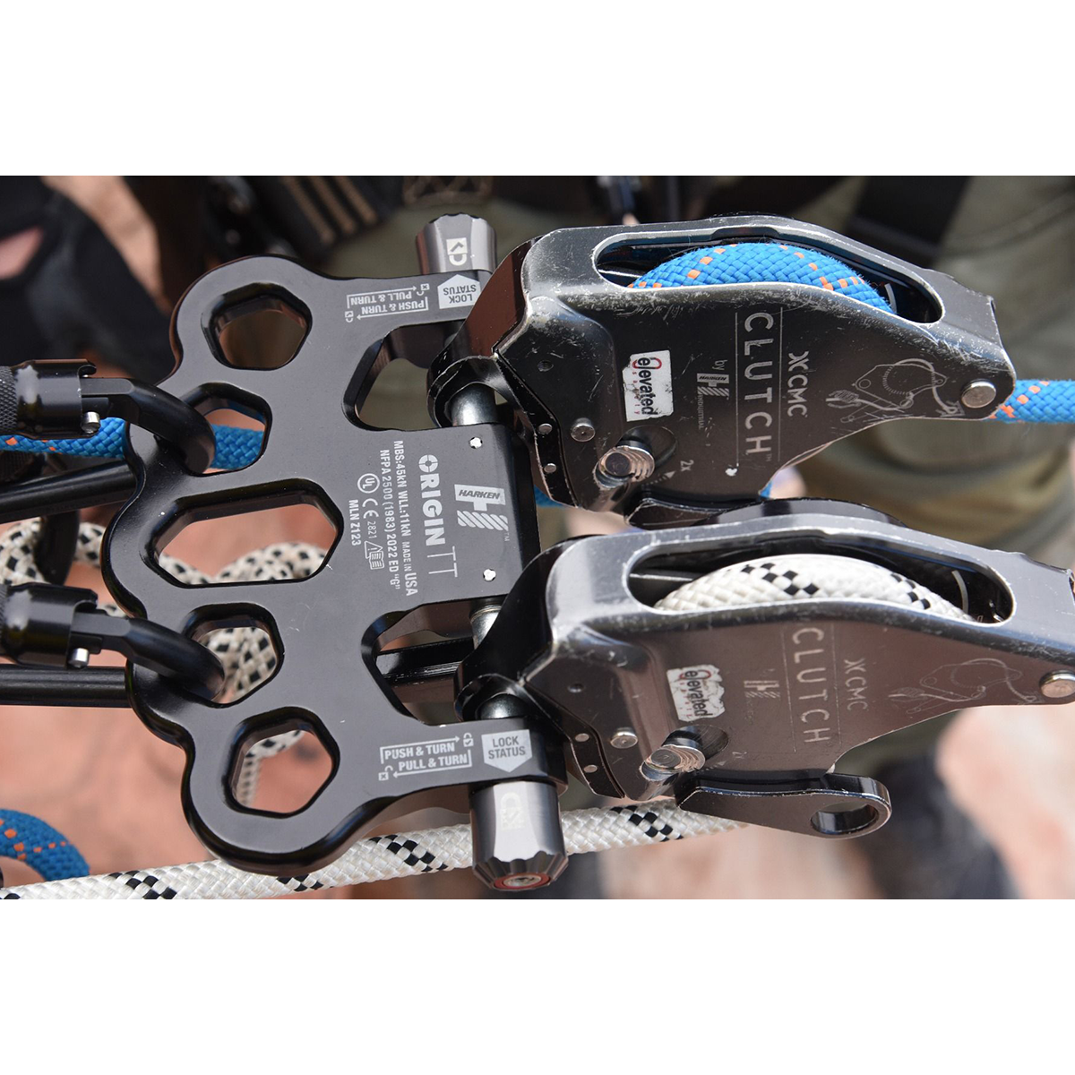 And set-up is simply easier. On the raise/lower side, Origin TT provides a seamless link with Harken Clutch and similar multi-purpose devices from other manufactures, eliminating the need for carabiners and shortening overall system length. There are five attachment points on the anchor side which enable rigging of ‘SERENE’ systems (Systems Strong, Equalized, Redundant, Efficient with No Extension potential.) Eliminating carabiners also removes play in the system that can diminish coordination between the two lowering devices which remain immediately adjacent and aligned. This facilitates the coordinated precision that results from the dual-handled operation (Sharkfinning) where Origin TT excels. Lowering happens at the same pace on each device, greatly diminishing uncomfortable jerking for the humans at the end of the line. The connected devices stay better synchronized and better aligned with the load on hauls which become more efficient as well.