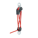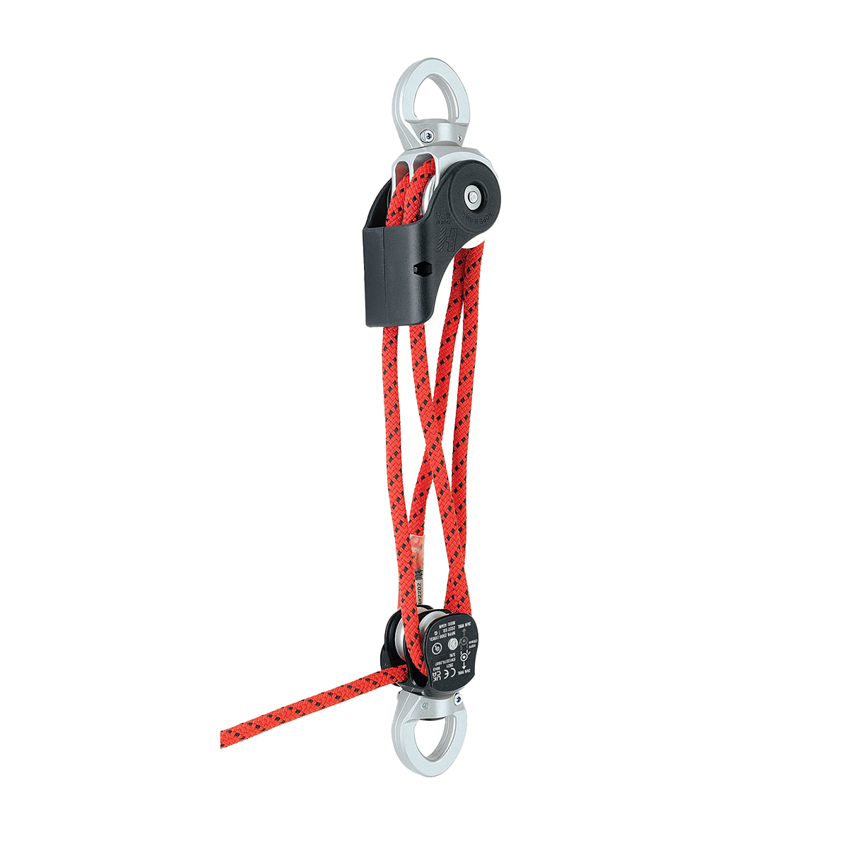 The WingMan is a mechanical-advantage device for load lifting and releasing. It is used in fall protection or work-at-height systems. It is intended for work at height, access, and rescue use. It can be used for human suspension for up to a 3 kN load. The WingMan consists of two swivel pulleys and a manufacturer-supplied rope. One pulley is a double with a becket to dead end the rope. The other pulley is a double with a ratchet and cammed sheave with a releasing handle allowing the gradual release of the mechanical advantage system under load. The releasing handle is located at the operator’s end. Anodized aluminum is used throughout the pulleys. The handle is glass-reinforced nylon. The rope is an 8 mm static polyester with a sewn termination and is not to be substituted. Pulleys have stainless steel axles and fasteners. The ratchet mechanism is stainless steel.