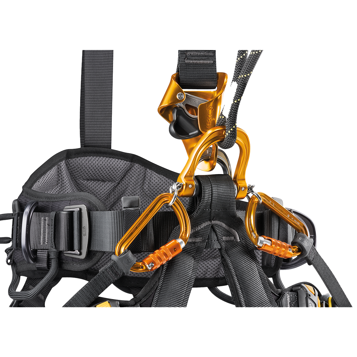- Ventral attachment point: Attachment for a descender, a positioning lanyard for use in single mode, a progression lanyard, and a seat