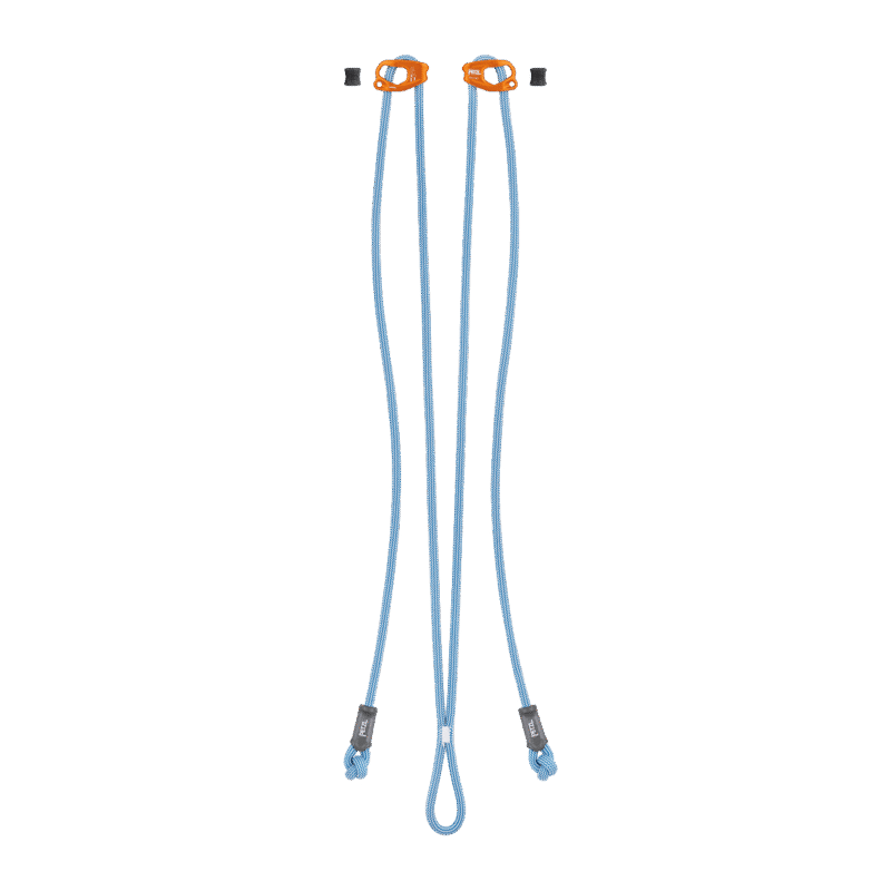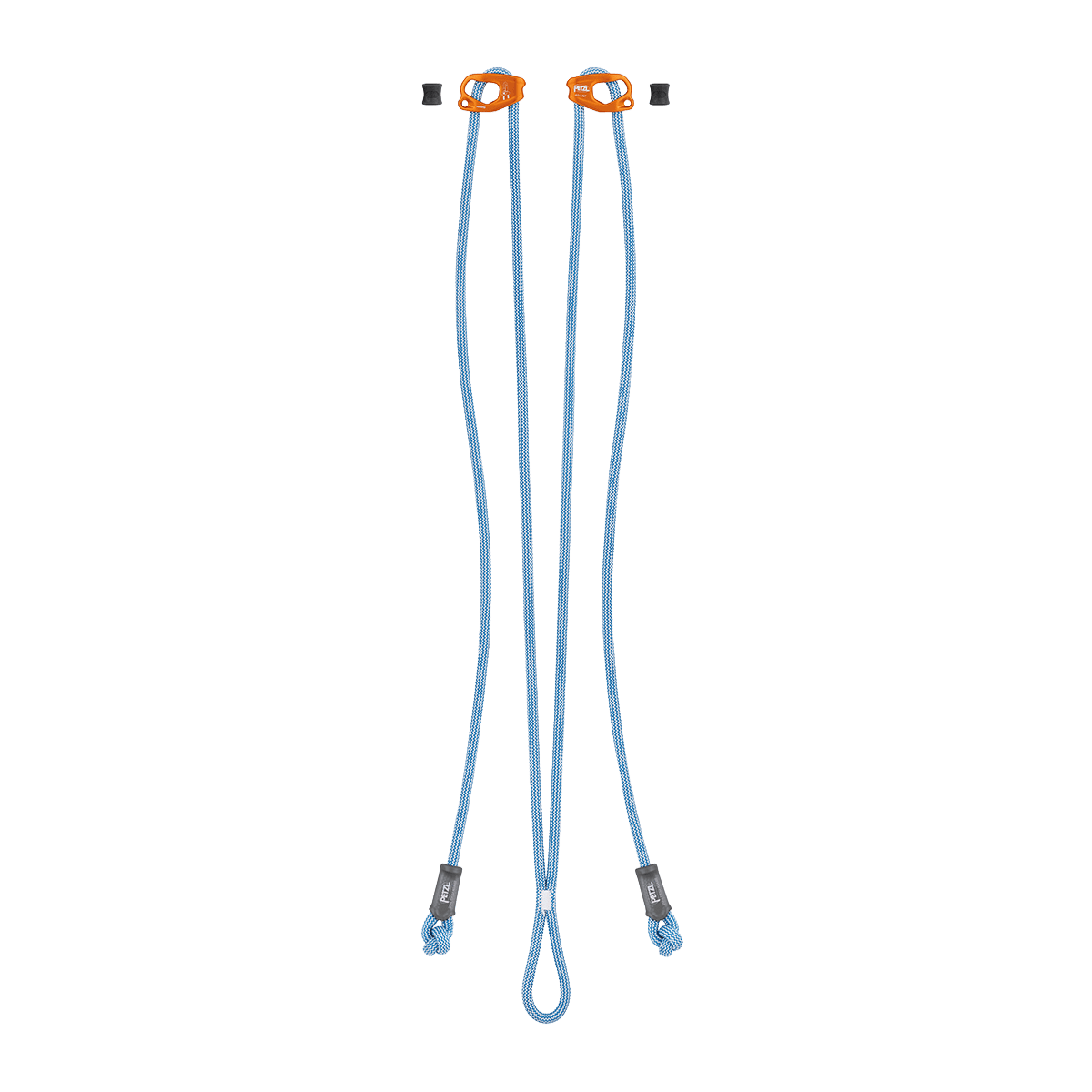 The Petzl Dual Evolv Adjust double lanyard has two adjustable arms, allowing the user to adjust the length of each arm individually for aid climbing. The two Adjust rope adjusters are ergonomic and allow simple and quick one-handed length selection of each adjustable arm.