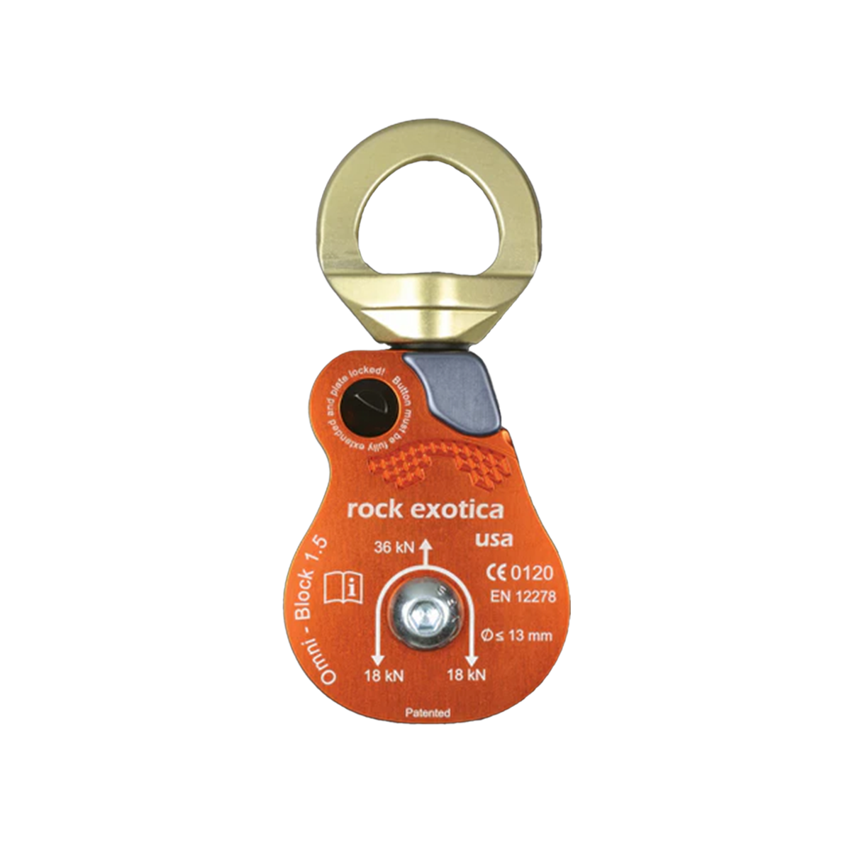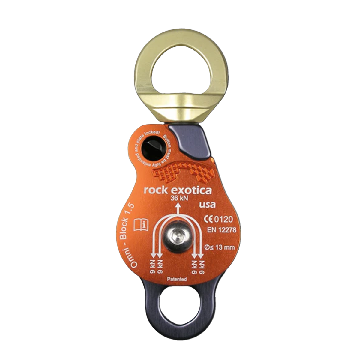 The Omni-Block combines a swivel and pulley into one tool, and incorporates a unique sideplate that opens while the pulley is still attached to the anchor. Traditionally, a pulley is connected to a swivel by a carabiner. However, the Omni eliminates the need for the carabiner, reducing length and pieces of equipment in the rigging system. The short length of the Omni is important when used in high-angle, confined space or other space-sensitive rigging environments.