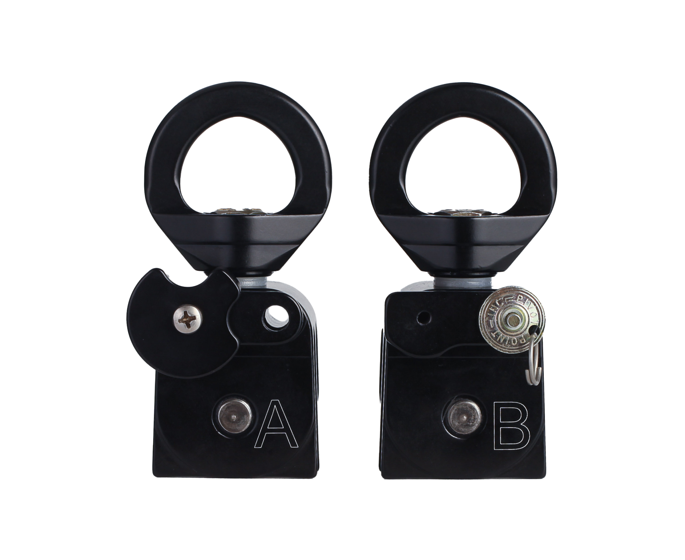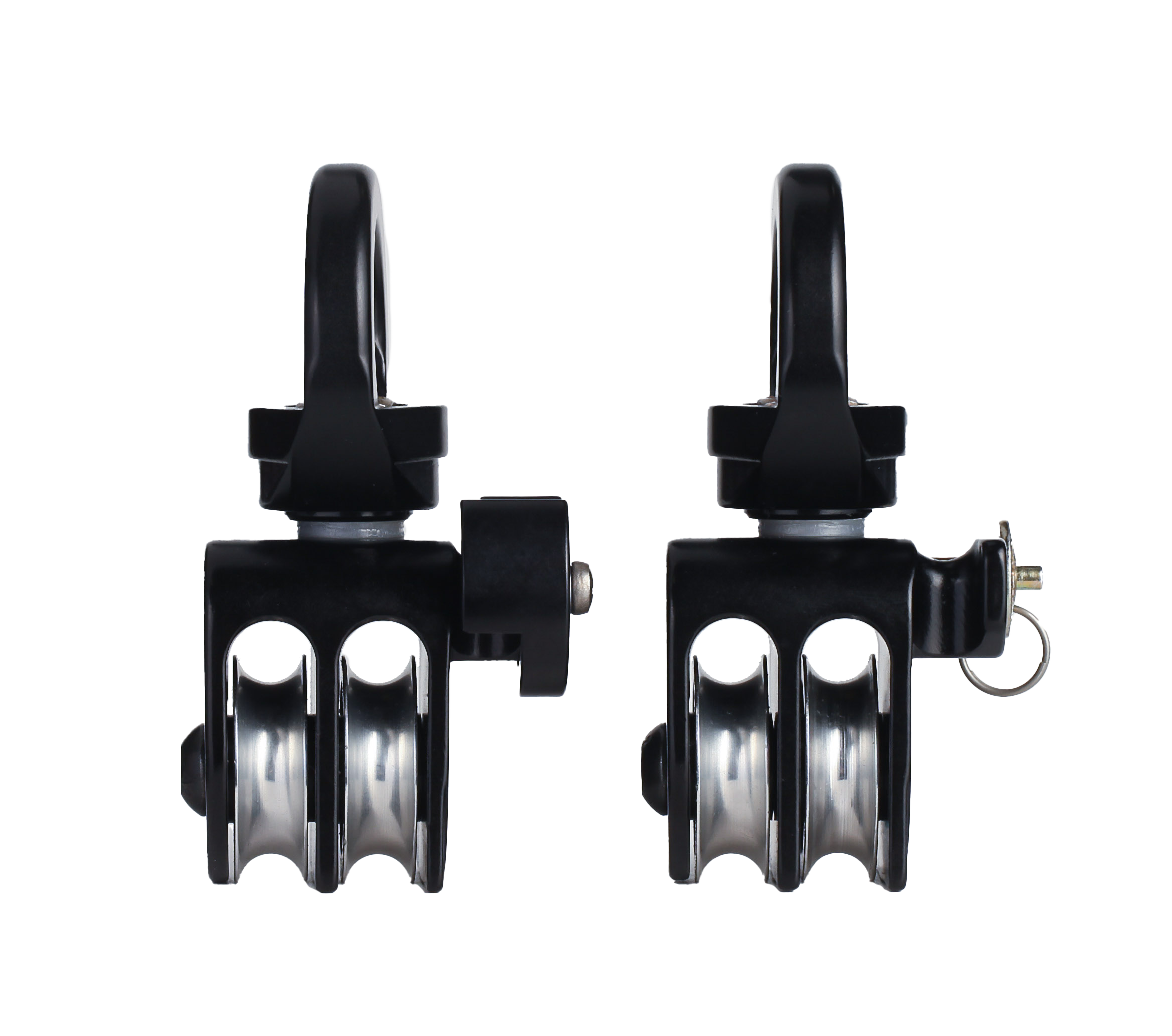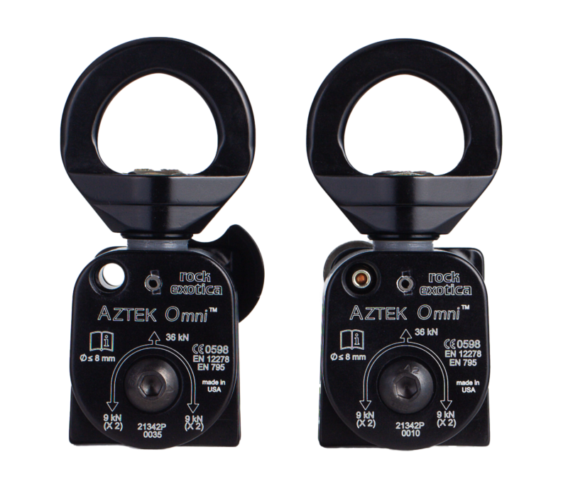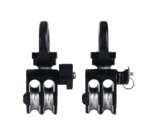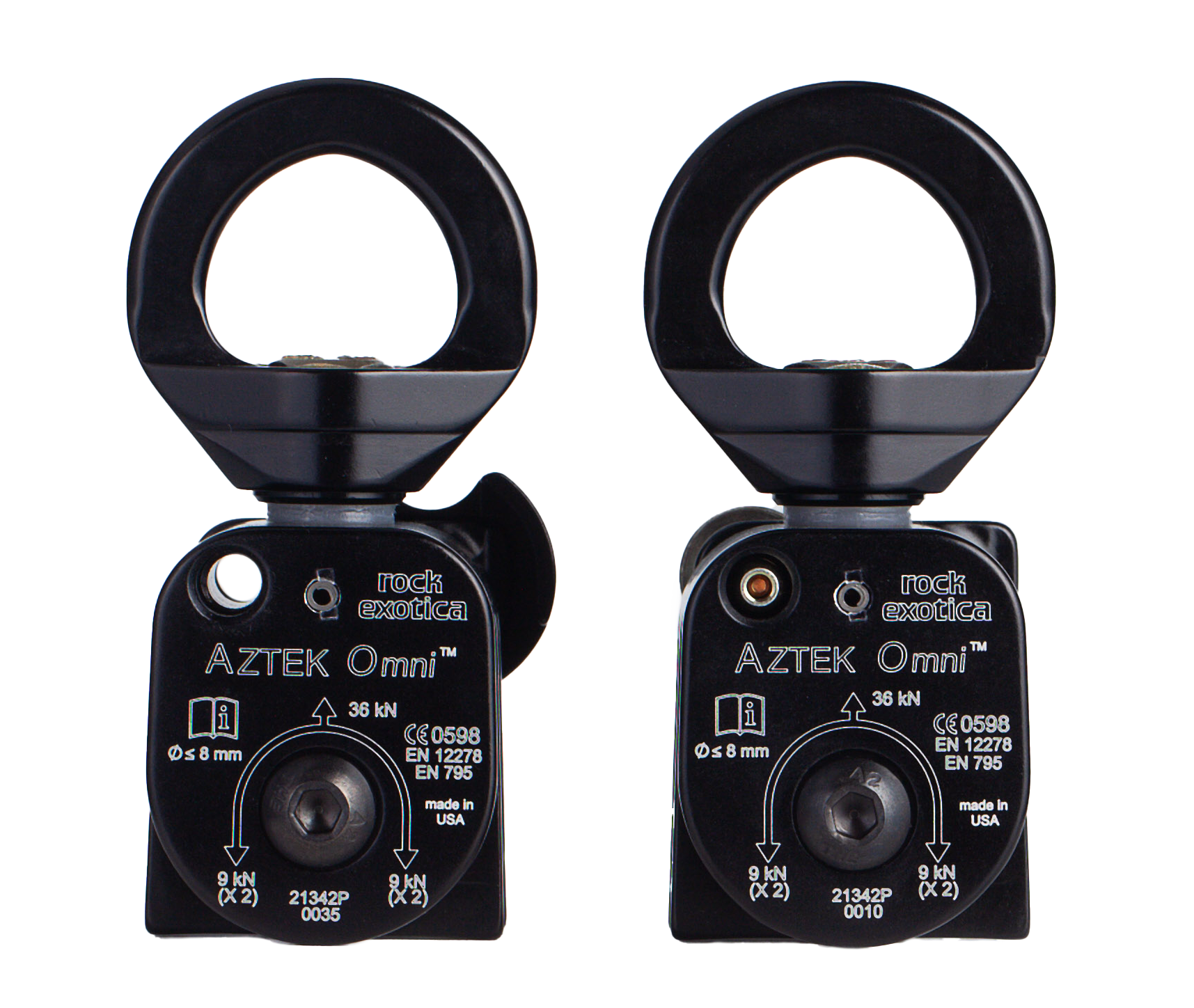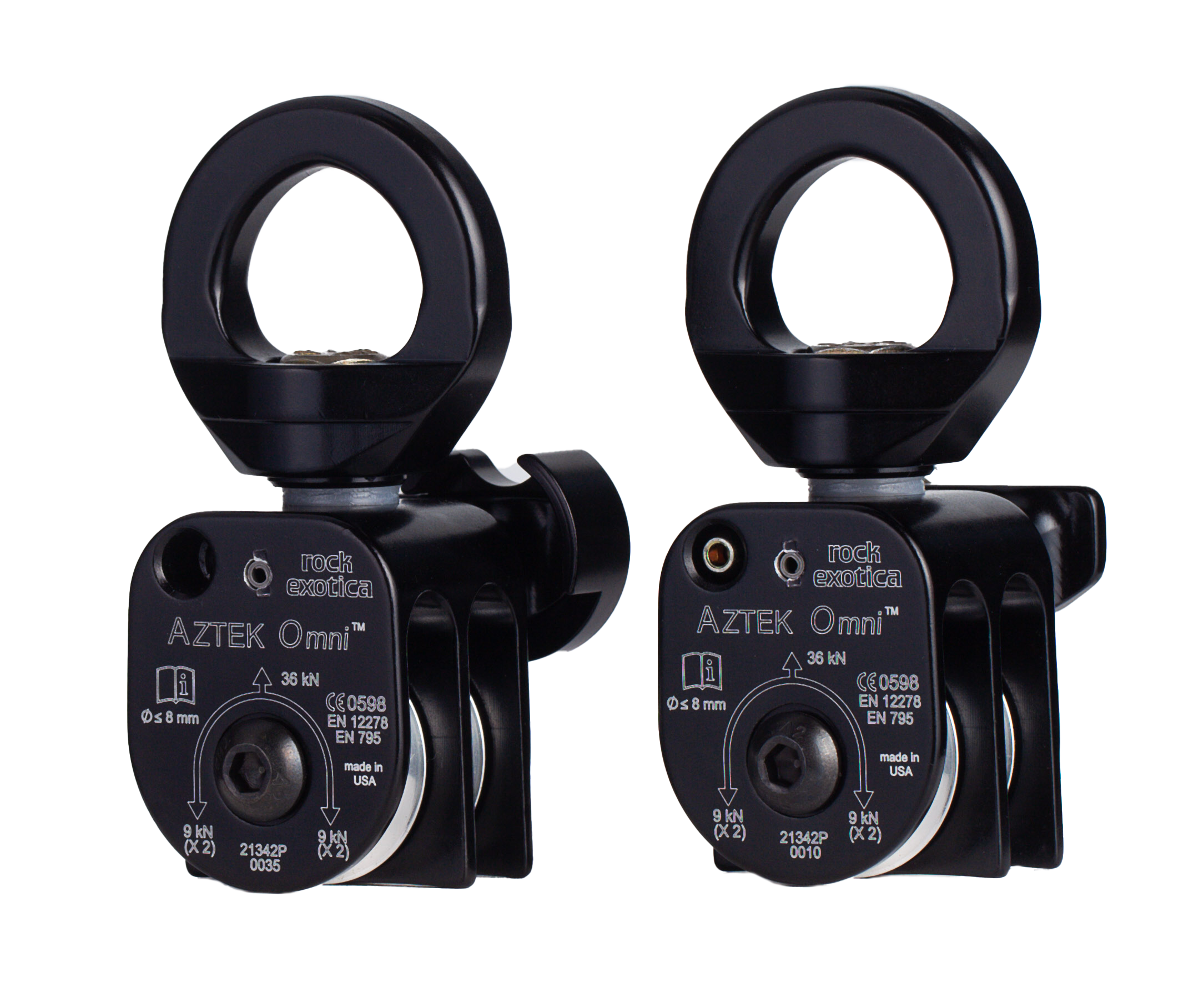 Replacement pulley set for the Rock Exotica Aztek Kit. The pulley blocks and sheaves are machined from solid aluminum, feature swivel connection points, and utilize high-efficiency bearings. Includes: