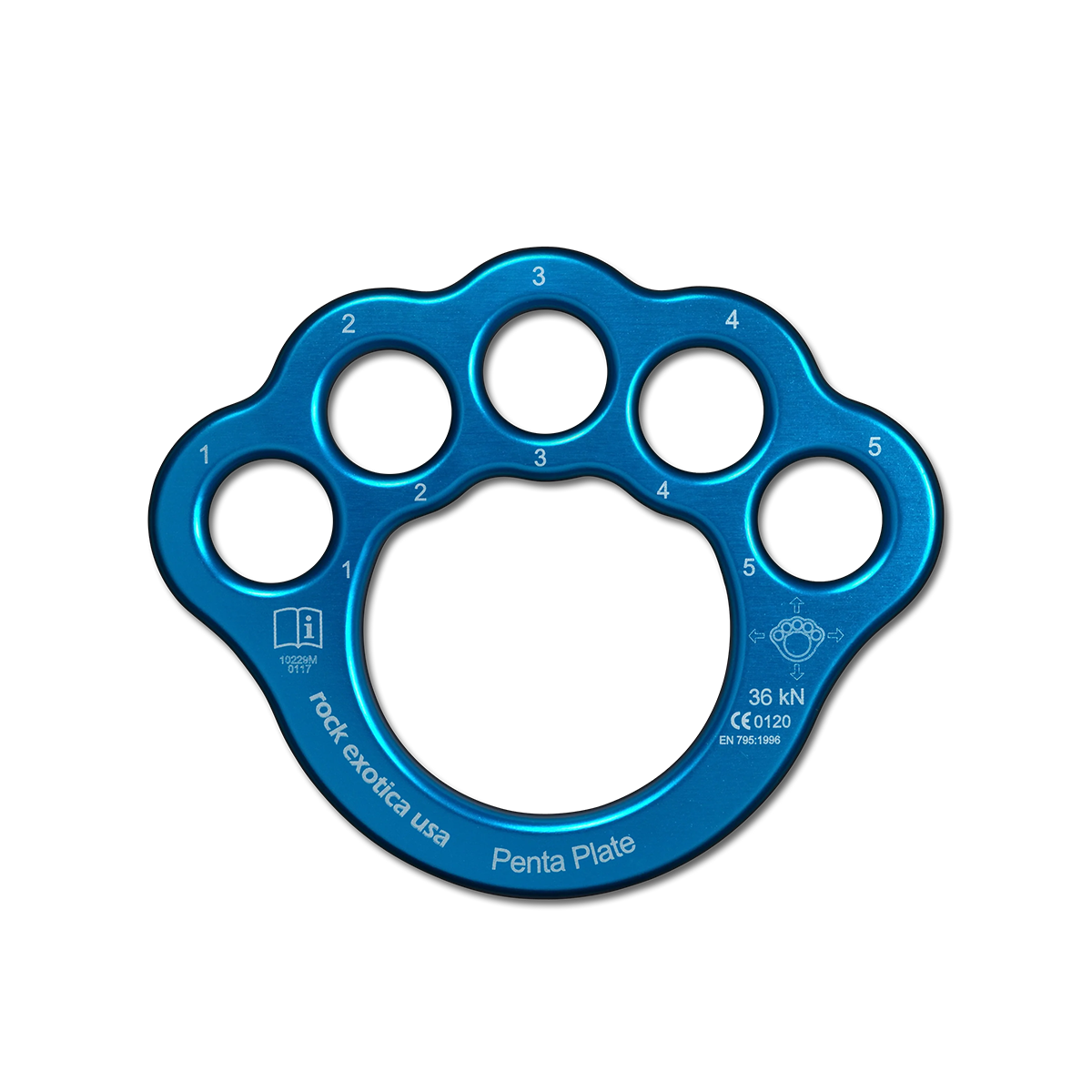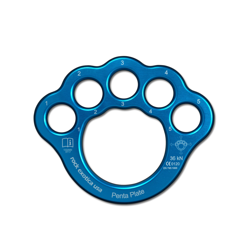 Made of 7075 aluminum alloy, the Rock Exotica PentaPlate is lighter, thinner and stronger than comparably sized rigplates made from less expensive 6061 alloy. The PentaPlate features numbered holes to assist with detailed rigging
