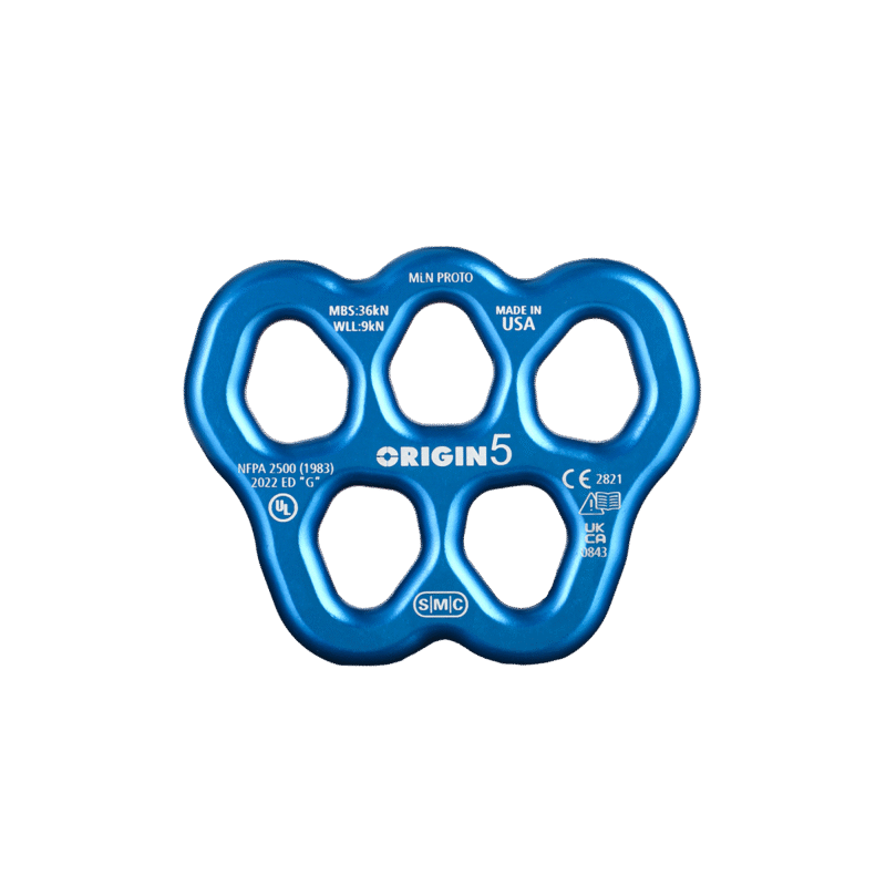The Origin 5 is SMC’s lightest rigging plate has just the right number of connection points to keep your rigging organized and it is ideal as a master point for litter bridles. The large connection holes allow you to easily rotate most locking carabiners. Strong, with an MBS of 36kN in any direction, the Origin 5 is manufactured with custom tooling to create textile-friendly rounded edges.