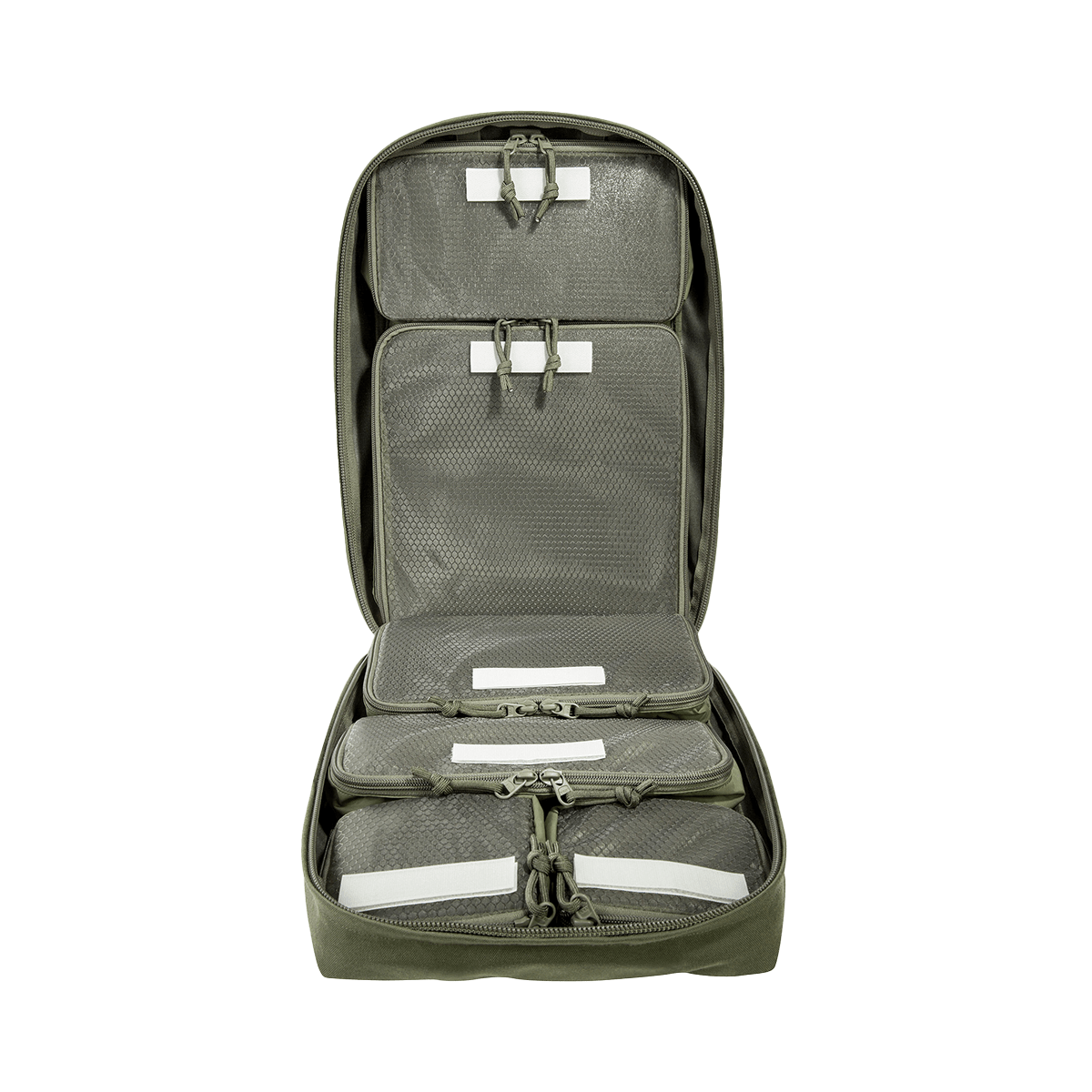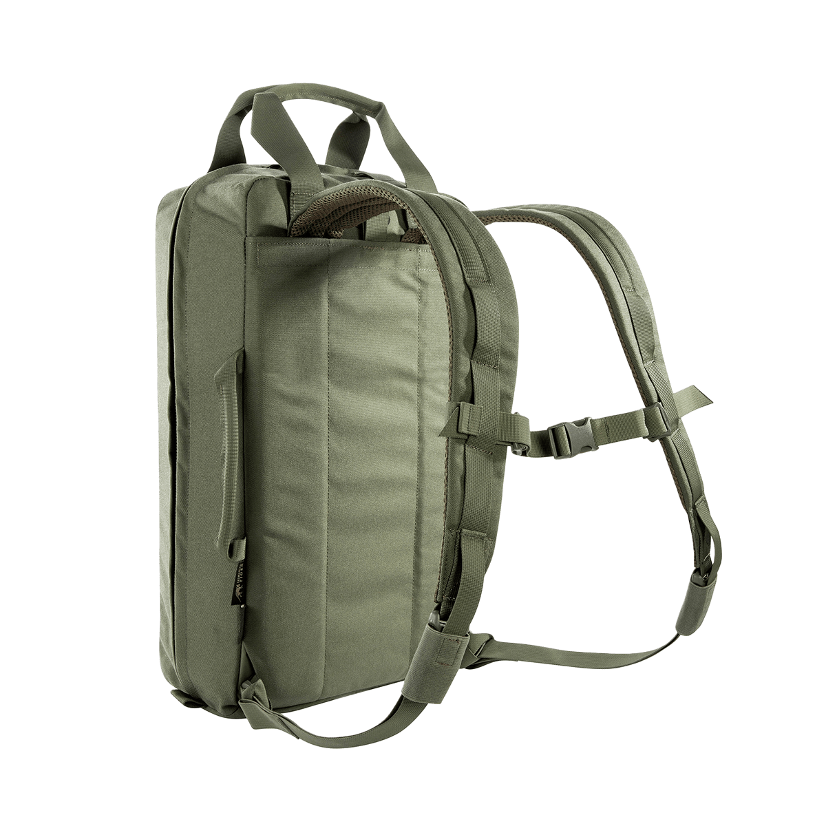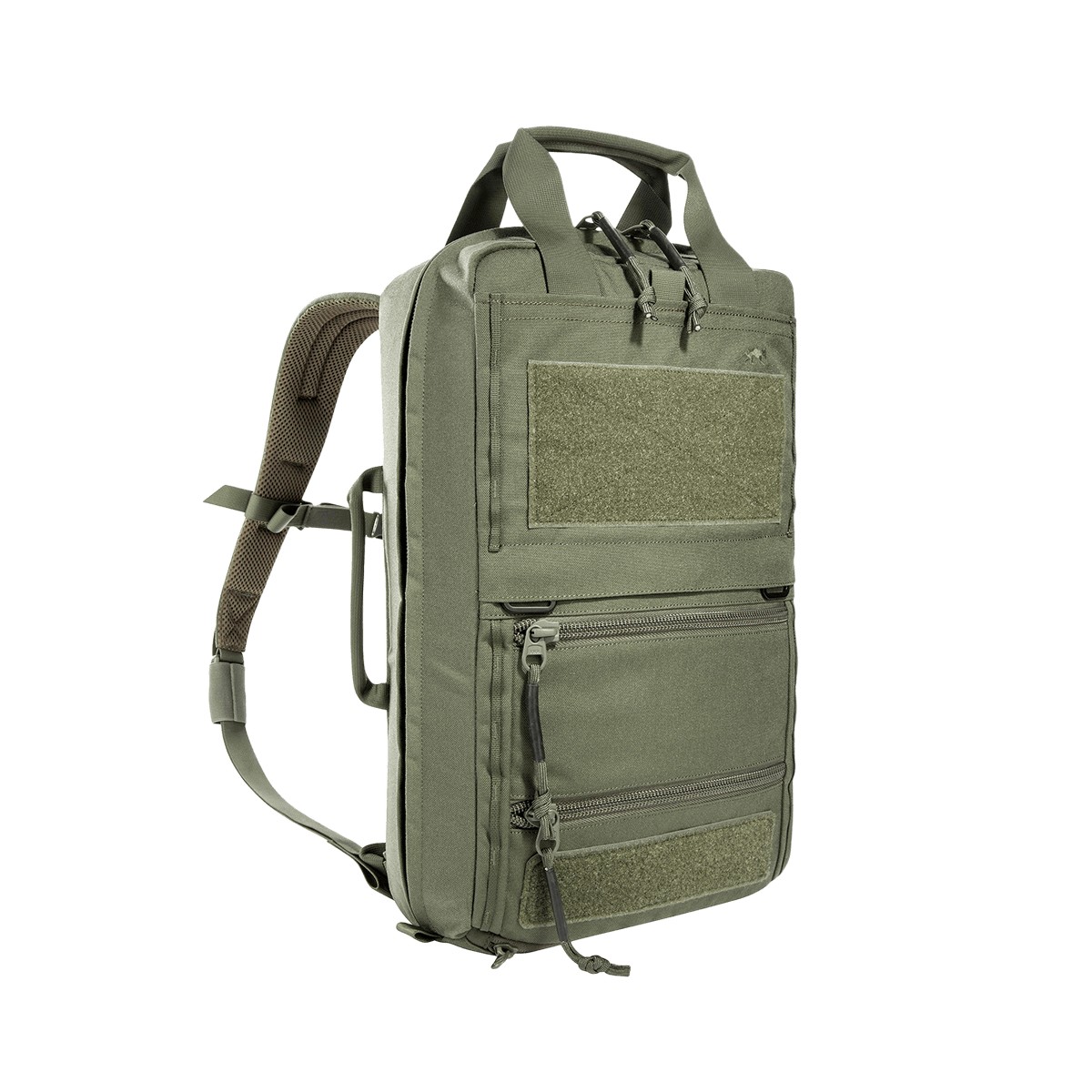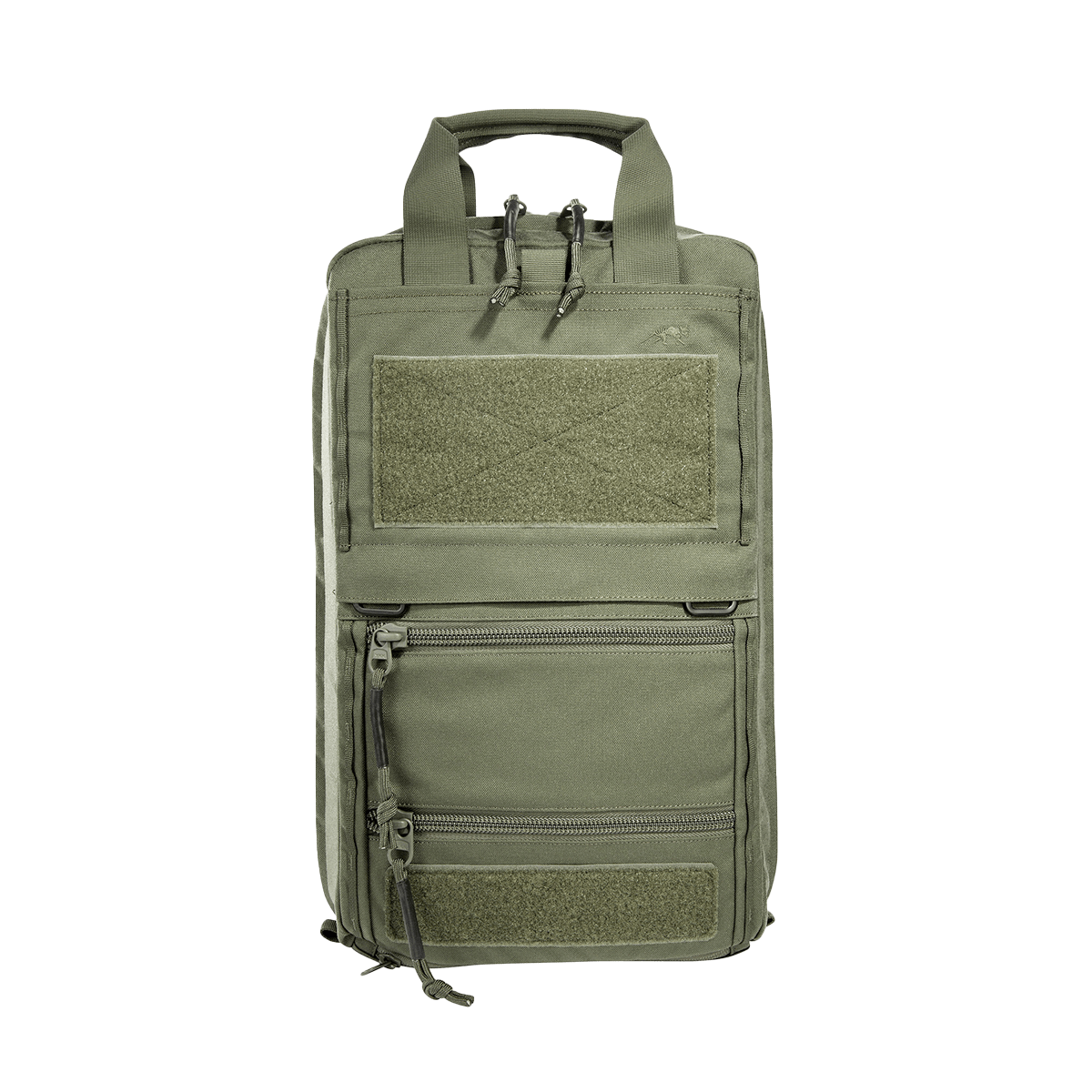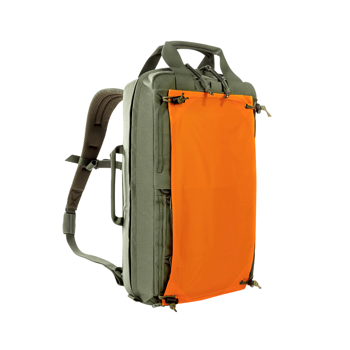 The TT Survival Pack offers the right size and equipment for the most important survival utensils. The fully expandable main compartment features six pockets of varying sizes with transparent lids, two of which can be removed. The main compartment is also covered with a large MOLLE hook-and-loop area, which allows for individual additions. The bottom compartment contains a double-sided rain cover (one side with stripes in warning orange) and a tac marker. Two shallow zippered compartments on the front are great for storing documents, for example. Additional pockets or panels can also be hooked into the existing hooks on the front. Backpack shoulder straps as well as carrying handles can be stowed when the backpack is stored in vehicles.