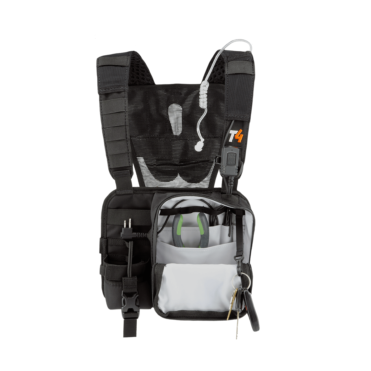 • The main pocket has interior organizer sleeves for tools and pens, a daisy chain for securing tools on lanyards, a key FOB to secure your keys, a bright interior colour so you can see your gear, and 2 exit ports that support the pathway for your ear piece wire so that you can keep it clear from snagging hazards.