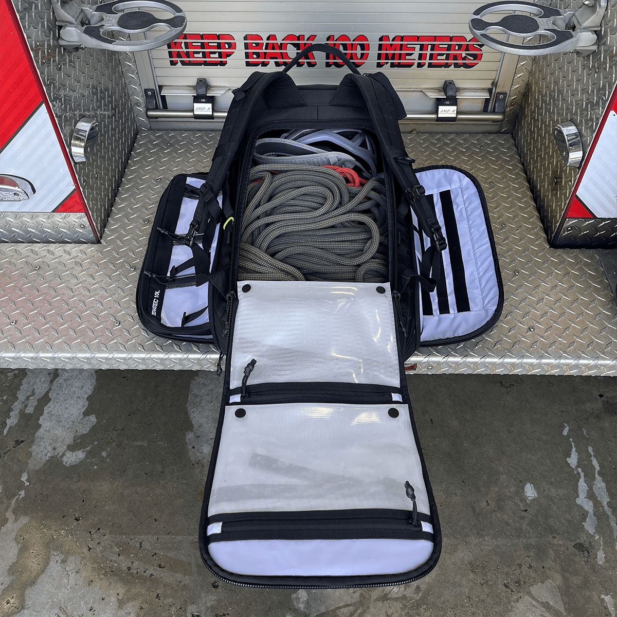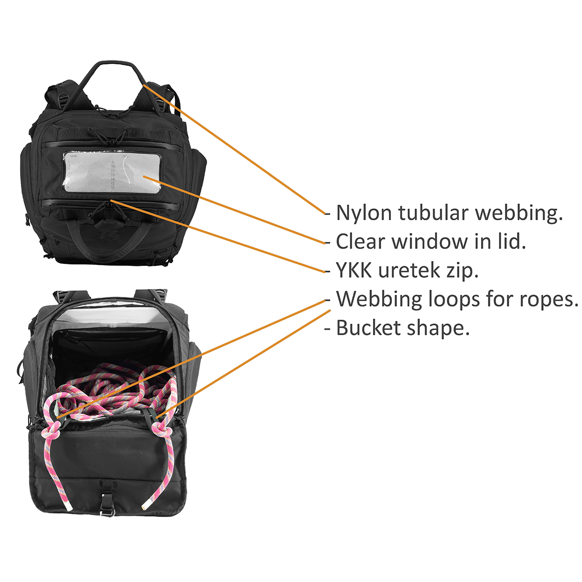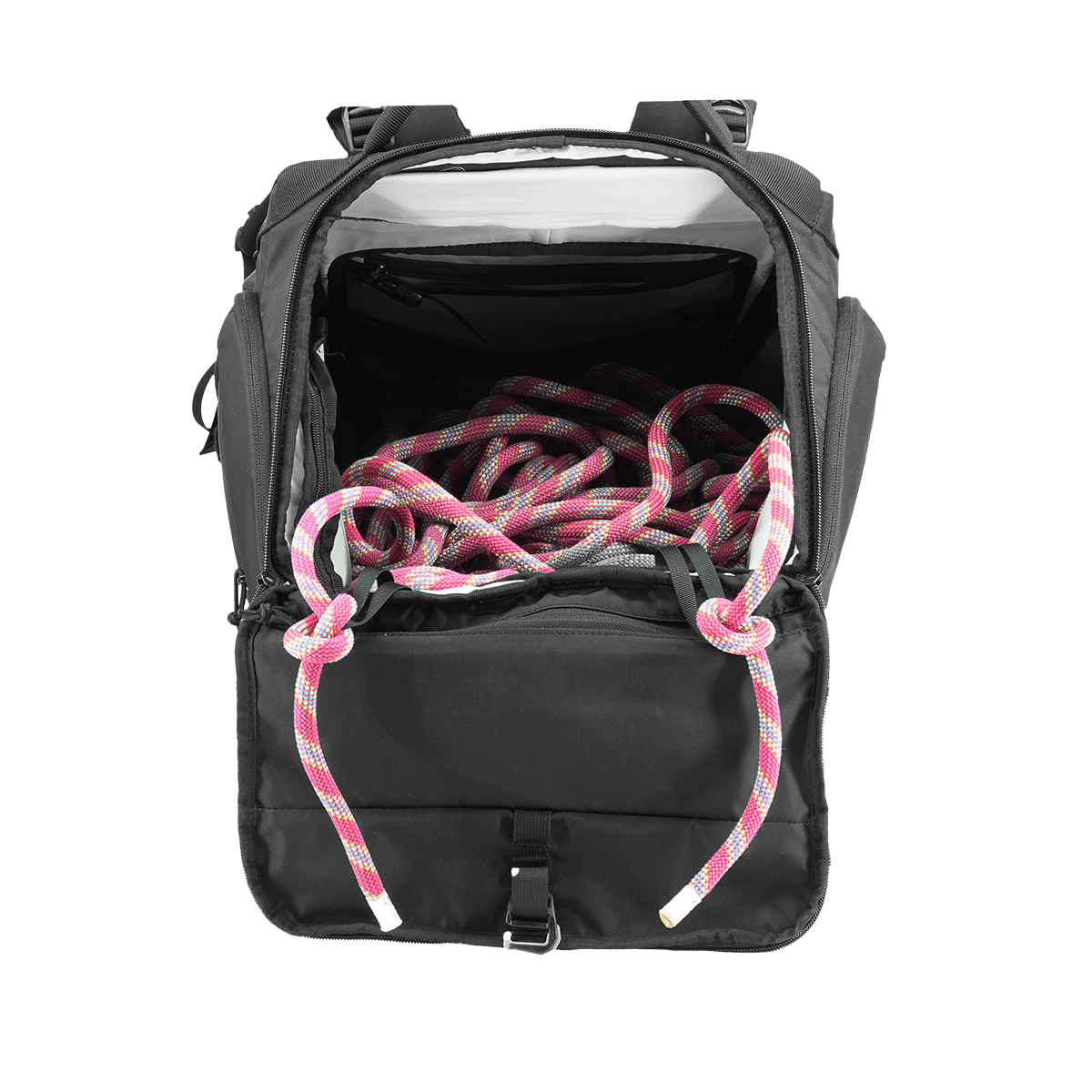 • Interior Features for Gear Organization – Equipped with dedicated rope tie-in points to securely fasten your rope during use. Inside, you’ll find two internal daisy chains for easily clipping additional hardware. A built-in hydration bladder sleeve ensures you stay hydrated on the job, while a Velcro loop system allows you to customize your interior storage with compatible pouches, offering ultimate versatility for your gear setup.